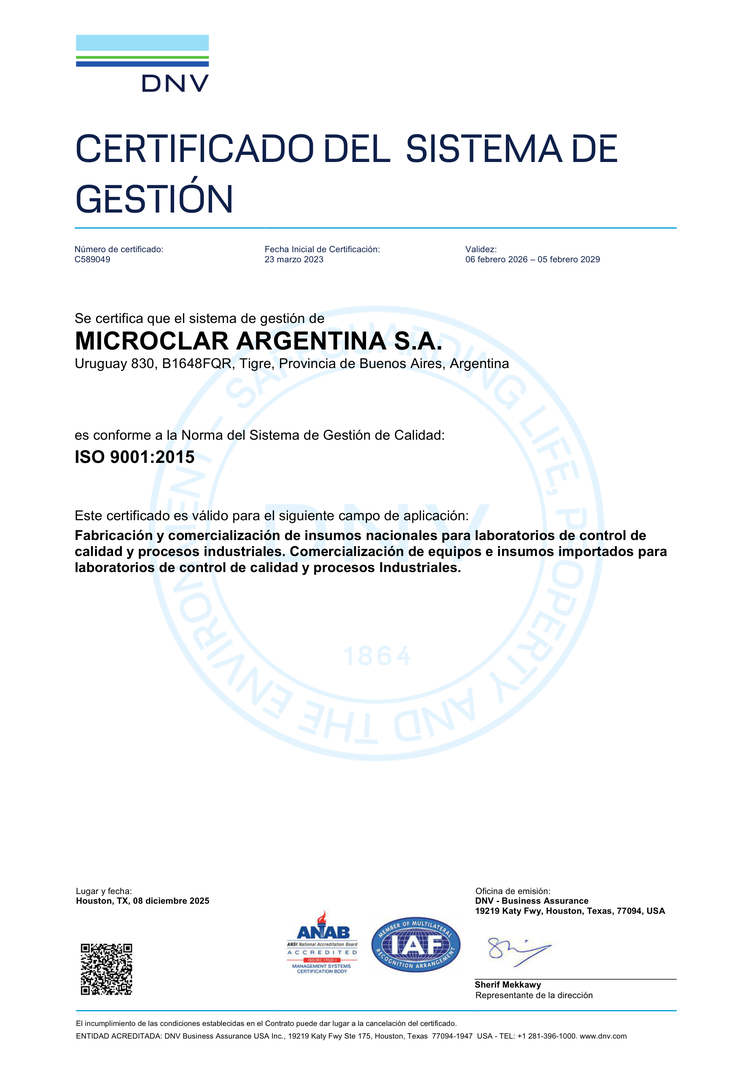 En el 2018 Microclar Argentina ha certificado ISO 9001:2015 para sus operaciones en las instalaciones de Tigre, con Det Norske Veritas,