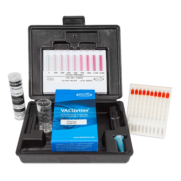 Los kits de fenoles de CHEMetrics emplean el método bien establecido de 4-aminoantipirina (4-AAP). Los compuestos fenólicos reaccionan con 4-AAP en solución alcalina en presencia de ferricianuro para producir un producto de reacción rojo. Con este método se detectan fenol, meta- y fenoles orto-sustituidos, y algunos fenoles para-sustituidos, en condiciones de pH apropiadas. El método es aplicable al monitoreo de compuestos fenólicos en aguas residuales. Los resultados se expresan en ppm (mg/L) de fenol.