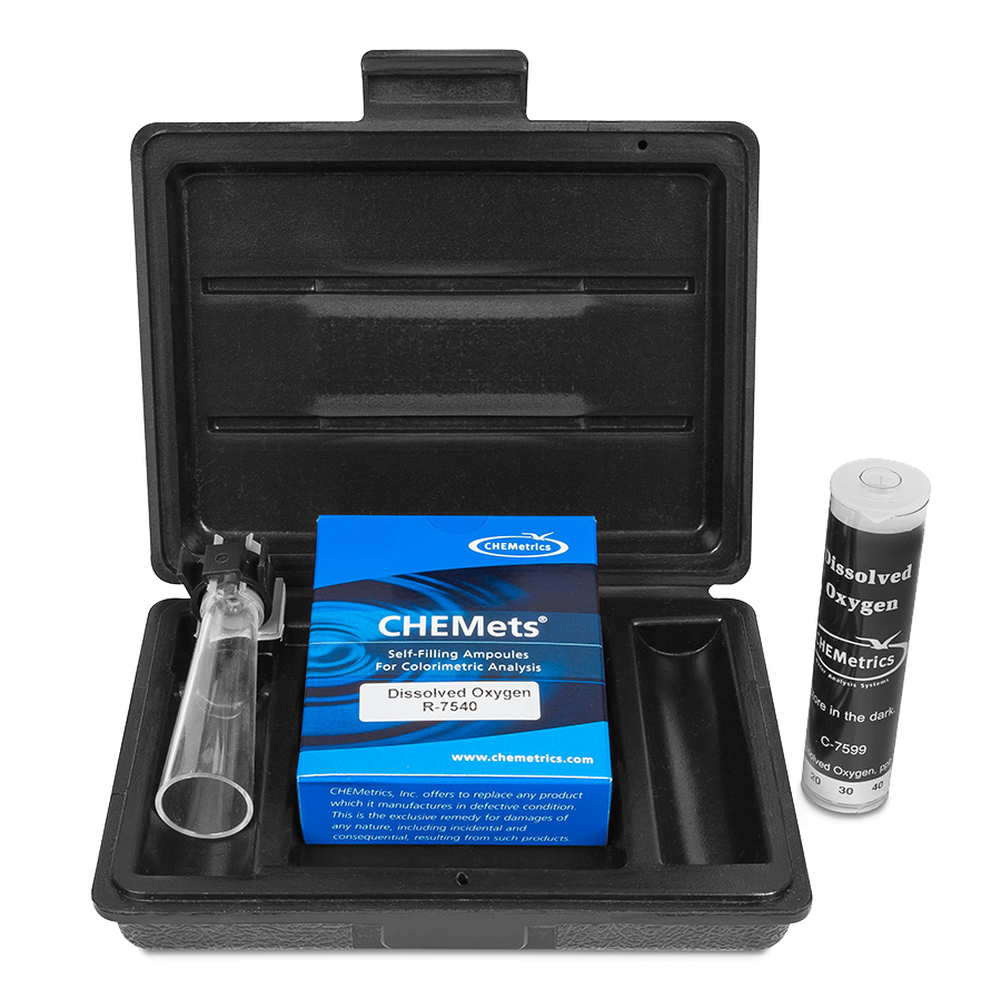 Kits de prueba para aguas de calderas y aplicaciones que requieren niveles de trazas de D.O. (rango ppb) emplean la metodología Rhodazine D. Desarrollado por CHEMetrics, Inc., y aprobado por ASTM como método de referencia para ppb D.O. En la determinación, el compuesto de Rhodazine D en forma reducida reacciona con el oxígeno disuelto para formar un producto de reacción rosa brillante. El método no está sujeto a interferencias de salinidad o gases disueltos. Los agentes oxidantes, incluida la benzoquinona, pueden causar altos resultados. Los agentes reductores como la hidracina y el sulfito no interfieren. Los resultados se expresan en ppm (mg/L) o ppb (ug/L) O2. Los kits de prueba de oxígeno disuelto de rango bajo incluyen un tubo de muestreo especial para uso con agua de alimentación de calderas. Este dispositivo permite al usuario romper la punta de la ampolla en una corriente de muestra que fluye para evitar errores de contaminación por oxígeno atmosférico.